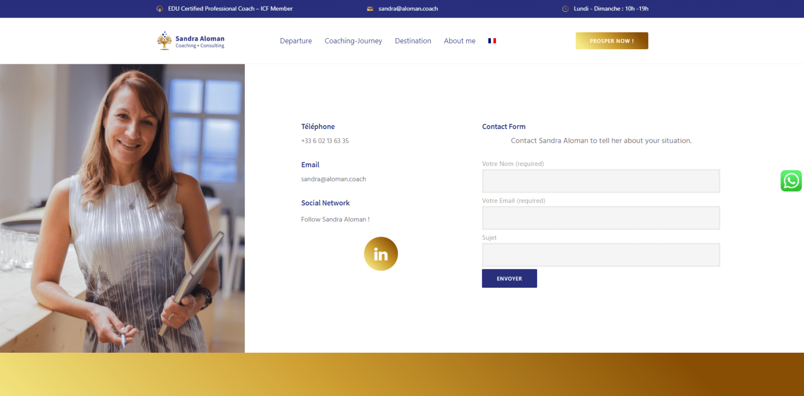 Ecrivaine et génératrice d’émotions, je mets aujourd’hui mon expérience de vie et de travail au service des autres via le « Life & Business Coaching » pour guider chacun d’entre vous vers la Prospérité !