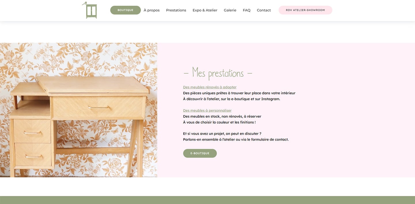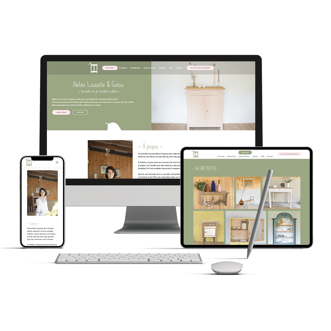 Notre mission pour l’Atelier Louisette & Gatou était de créer une page web claire et chaleureuse, mettant en avant la rénovation artisanale de meubles anciens et les prestations proposées. Nous avons conçu une navigation fluide permettant de découvrir facilement les créations, les services personnalisés et les ateliers de formation.