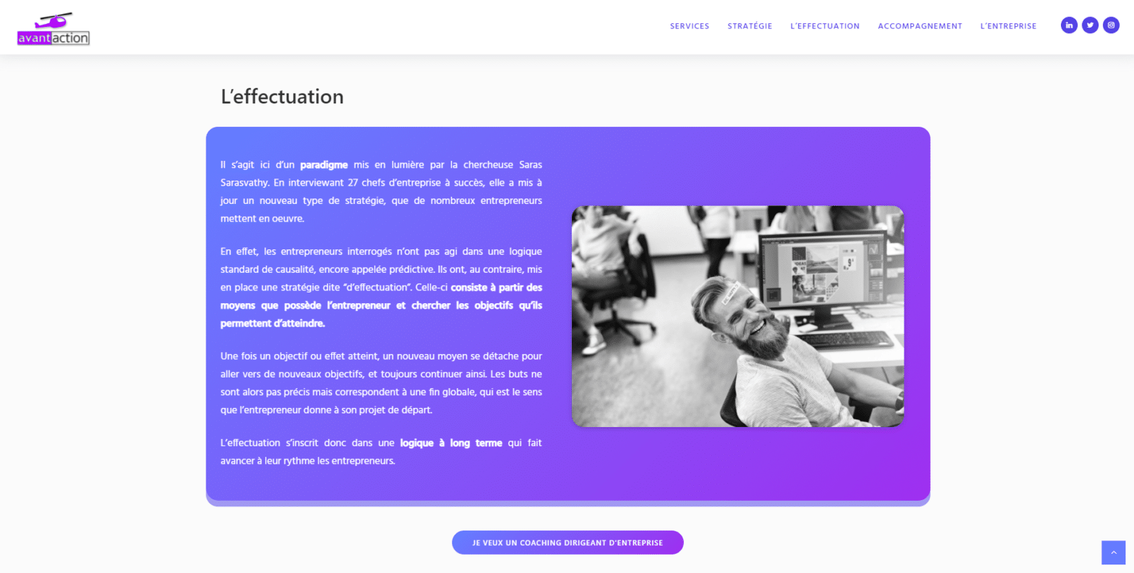 Avant Action a vu le jour en 1999 et proposait du conseil en communication globale pour les PME B2B. Nous nous sommes depuis tourné vers le coaching de dirigeants d’entreprise, dont l’effectif est inférieur à 250 employés.