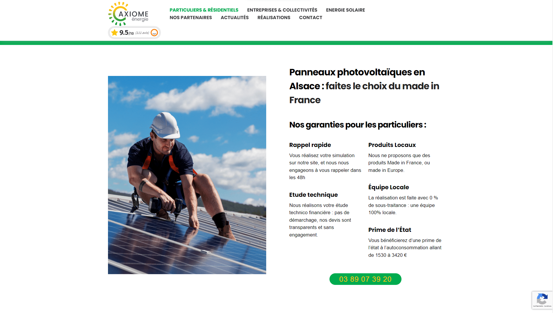 Axiome Énergie met en avant ses garanties pour les particuliers, notamment un rappel rapide, une étude technique transparente, des produits locaux, une équipe 100% locale et la possibilité de bénéficier d’une prime de l’État à l’autoconsommation pouvant aller jusqu’à 3420 €