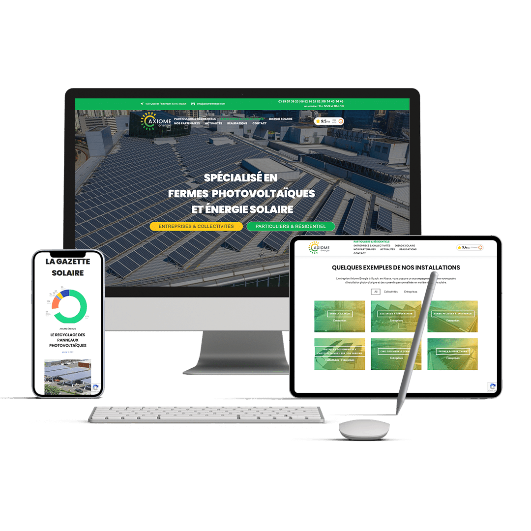 Axiome énergie nous a fait confiance pour la création de leur site web, dès à présent ils pourront faire parvenir à leurs communautés ou à leurs futurs clients la qualité de leurs projets et matériels avec de beau visuel directement visible sur leur page d’accueil !