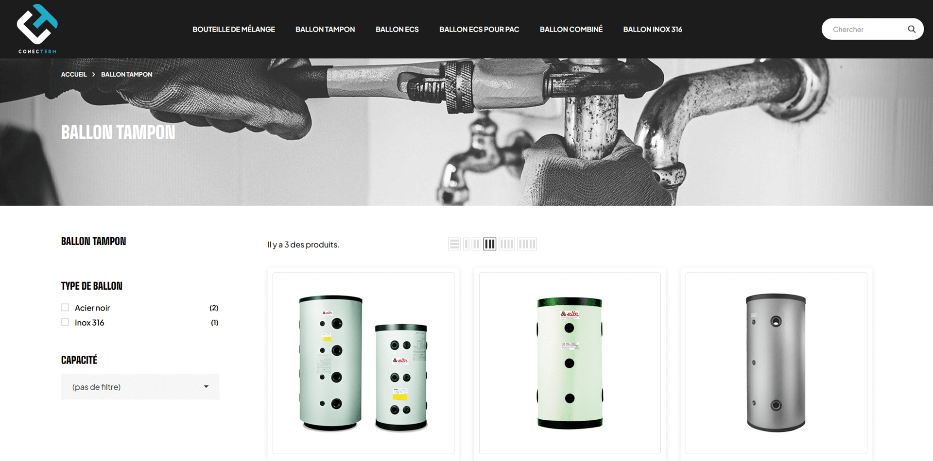 Le site met en avant l’offre complète de Conecterm : planchers chauffants, ballons d’eau chaude, chaudières électriques, robinetterie et systèmes de régulation. Chaque produit est détaillé avec précision pour guider efficacement les installateurs, distributeurs et prescripteurs dans leurs choix.
