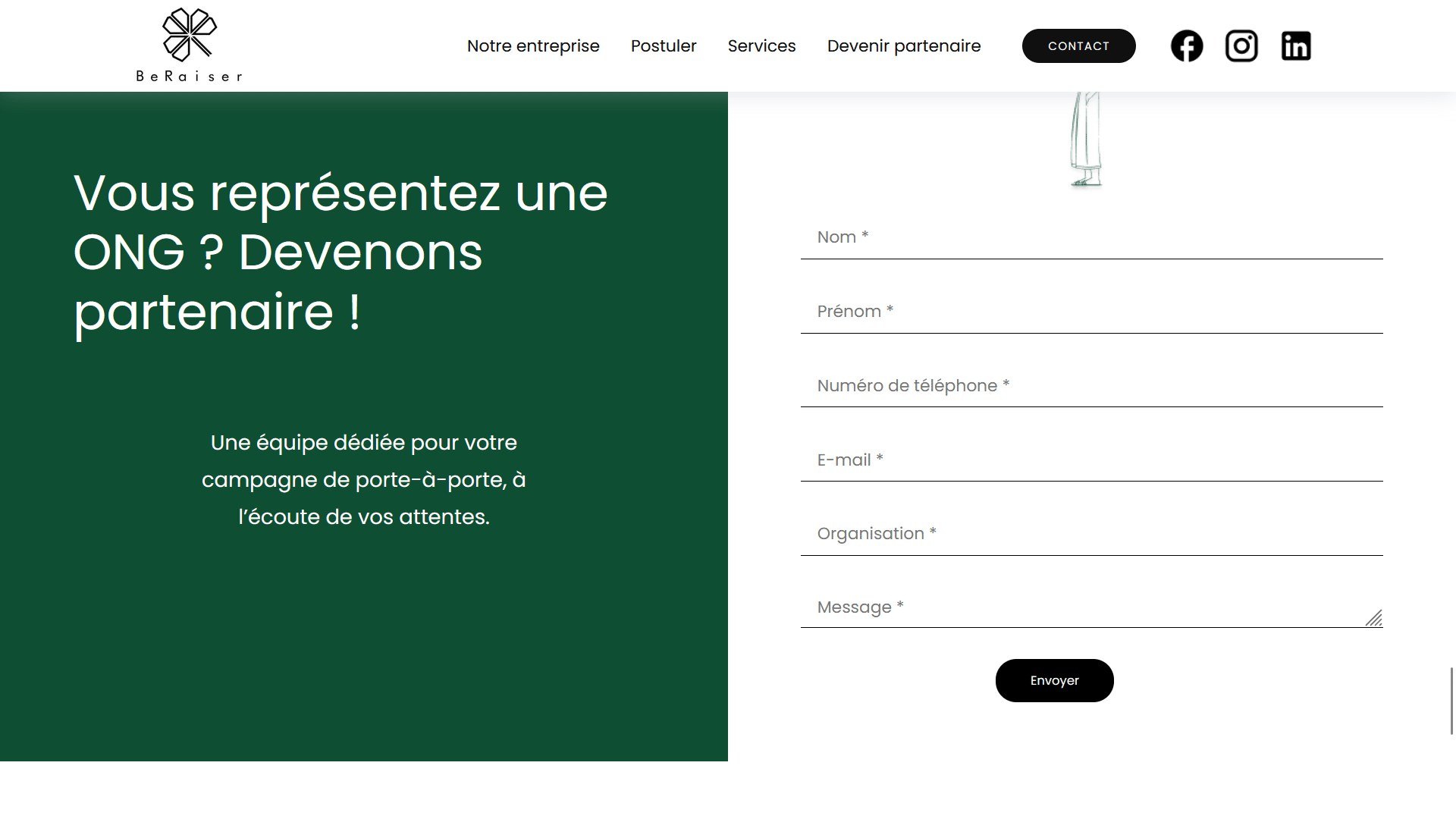 Ici tout est mis en place pour expliquer le concept de Beraiser. On a une présentation globale et enfin on met en place des blocs afin de parler des ONG puis de Fundraisers. Tout est hiérarchisé de façon à ce que chaque partie soit parfaitement claire. Après avoir tout lu, la personne peut directement contacter l’entreprise si elle est porteuse d’un projet ou d’une envie de travailler au sein de leur structure.