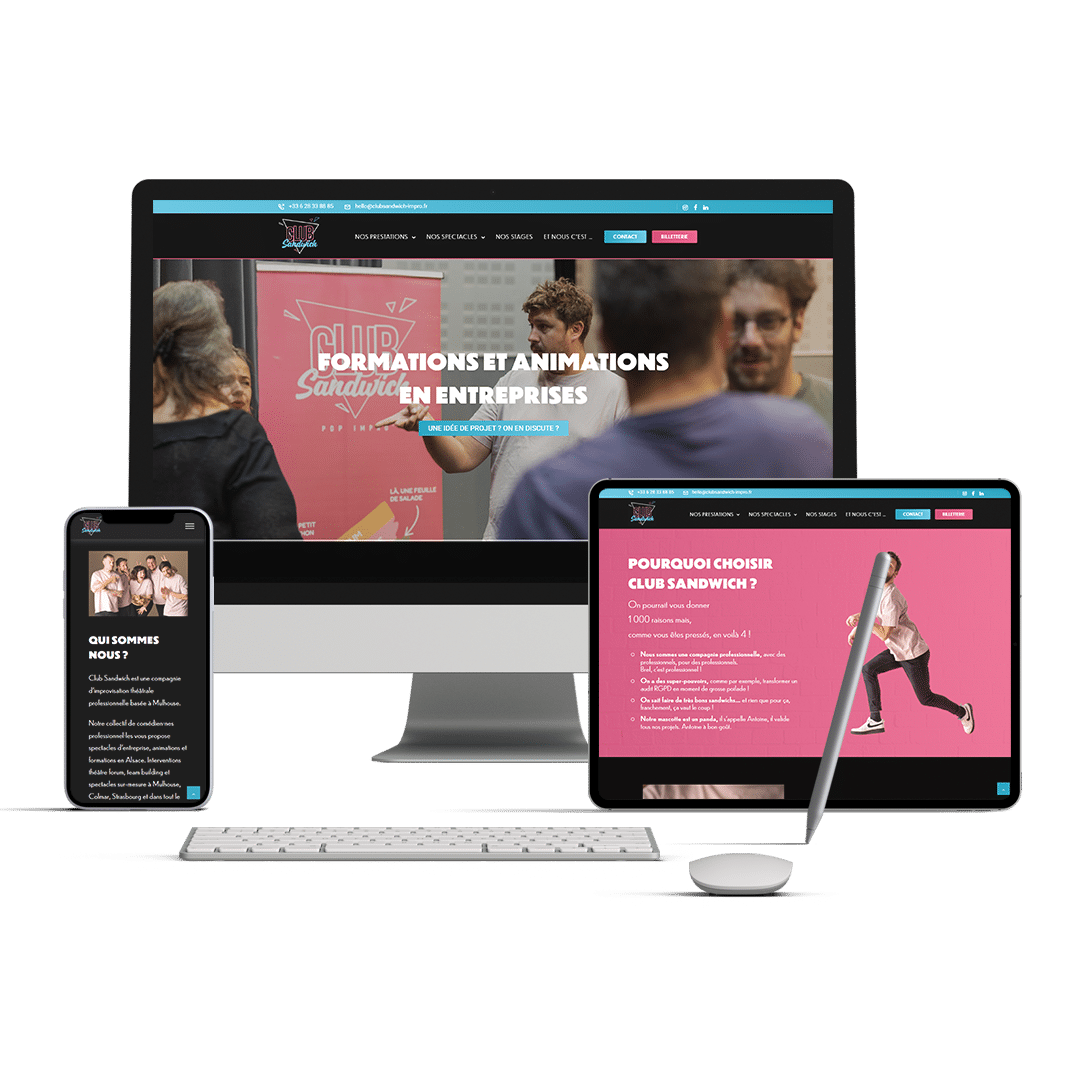 Notre mission a été de concevoir et développer le nouveau site web de Club Sandwich Impro, une compagnie d’improvisation théâtrale basée à Mulhouse. L’objectif : offrir une vitrine moderne, vivante et fidèle à leur univers créatif. Nous avons repensé l’arborescence et l’identité visuelle pour valoriser leurs spectacles, leurs formations et leurs interventions en entreprise, tout en rendant la navigation fluide sur tous les supports.