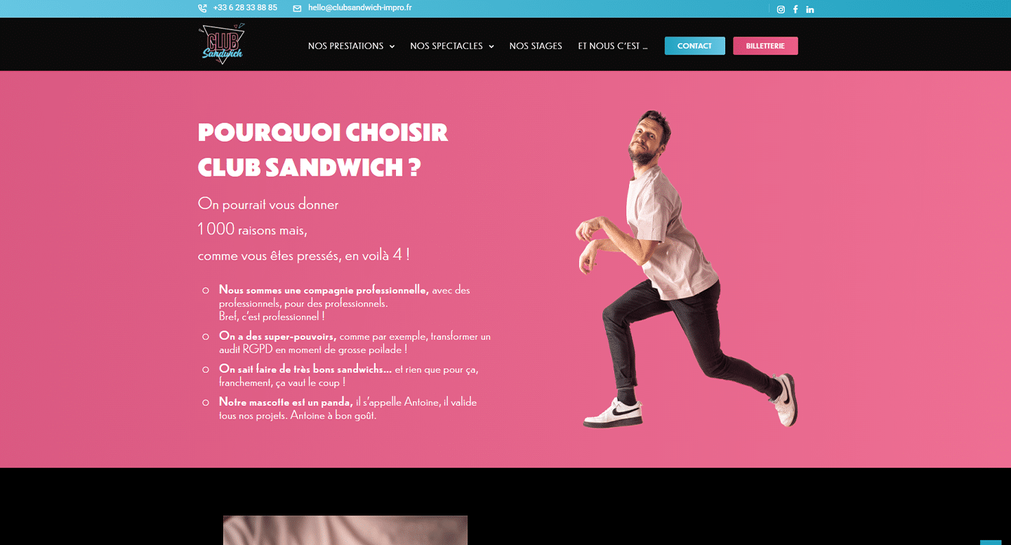 Le site intègre également un blog permettant à la troupe de partager son actualité, ses coulisses et ses projets, renforçant ainsi la proximité avec son public et sa visibilité en ligne. Le design met l’accent sur la spontanéité, l’humour et l’énergie du théâtre improvisé, avec des visuels expressifs et une structure claire. Ce projet a permis à Club Sandwich Impro de disposer d’un outil complet pour communiquer, promouvoir et faire rayonner son activité culturelle.