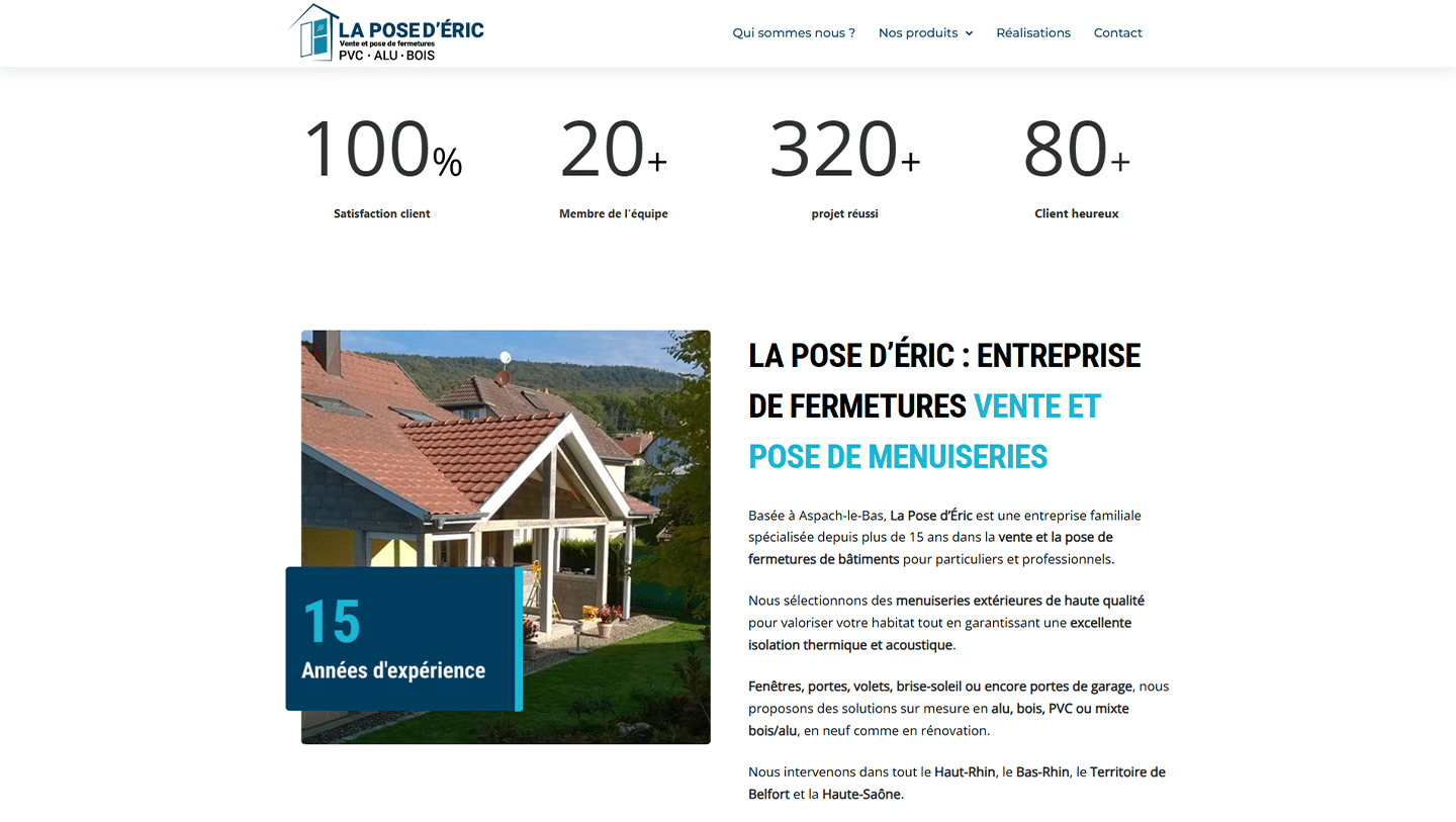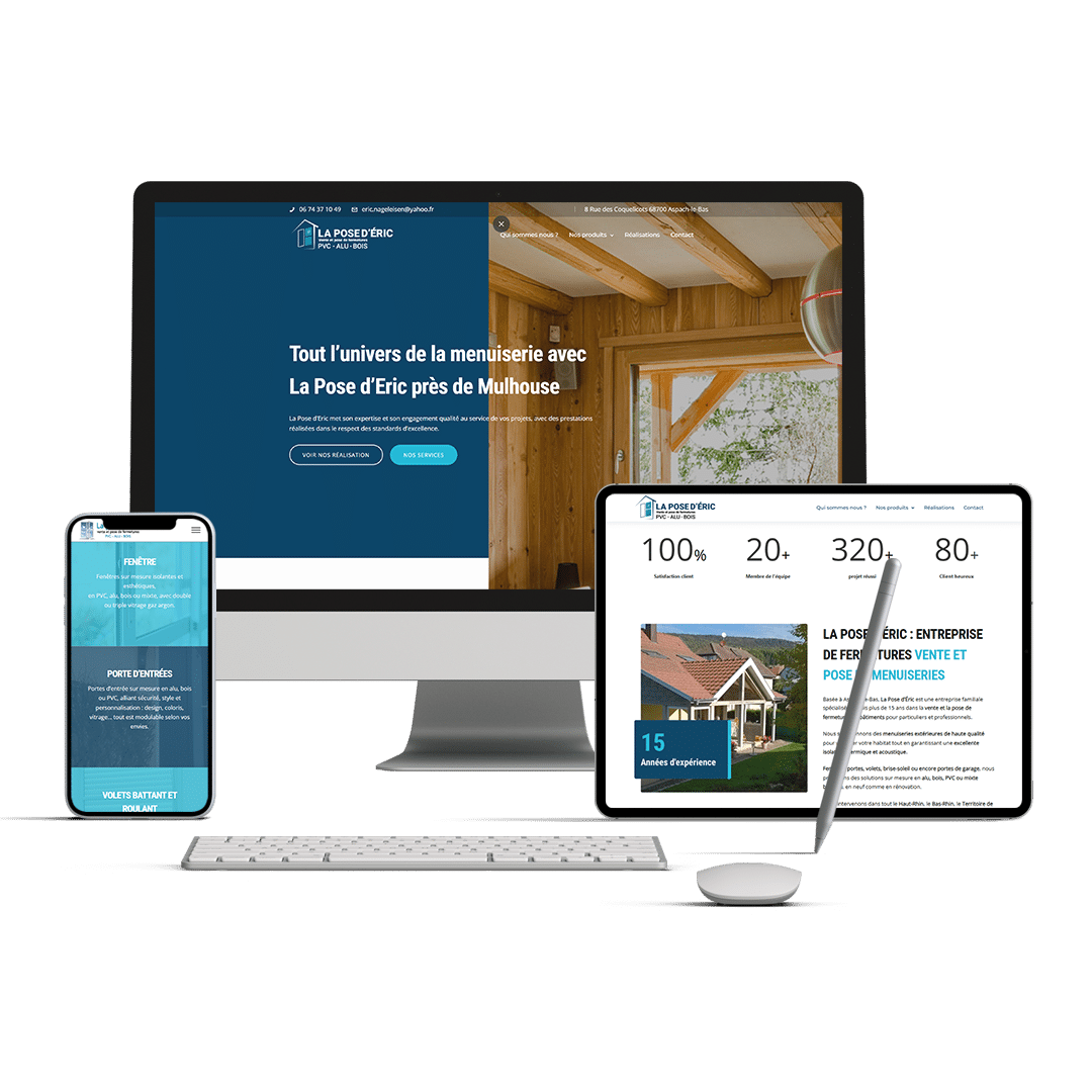 Nous avons réalisé la refonte du site vitrine de La Pose d’Eric pour moderniser son image et valoriser son expertise en menuiserie sur mesure. L’objectif : proposer un site clair, attractif et optimisé pour le SEO, tout en mettant en avant plus de 15 ans de savoir-faire.