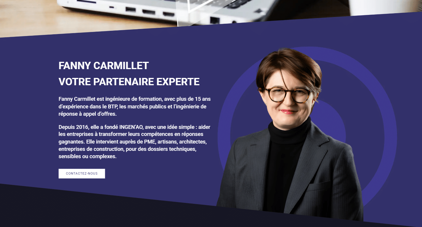 Après 15 ans en entreprise en tant que chef de projet d’étude de prix en bâtiment et Génie Civil, elle a décidé de proposer ses prestations d’ingénierie en appel d’offre aux entreprises. Faites appel à Fanny dans le cadre d’appel d’offre de travaux, fournitures et services !