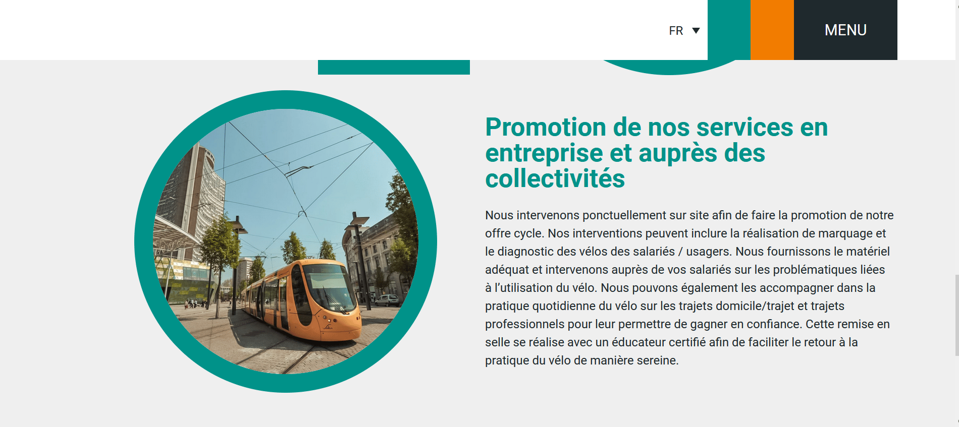 Location de vélo, médiation dans les transports ou accompagnement, le champ d’action de Mediacycle est vaste. Notre but vise donc à mettre toutes ces activités en avant. C’est avec la création d’un menu que nous avons décidé que chaque catégorie aurait son importance.