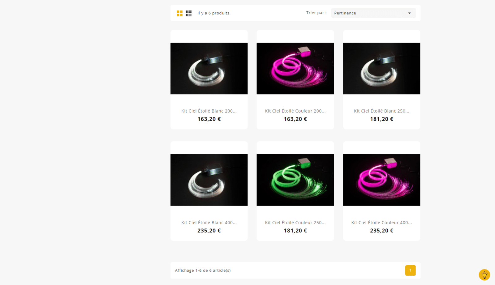 Découvrez notre sélection de kits de ciel étoilé parfaits pour recréer, chez vous ou pour votre entreprise, un plafond d’étoiles scintillantes réaliste et tendance. Vous êtes assuré d’une décoration originale, rare et chic pour une ambiance personnalisée. De 50 à 800 fibres, vous avez le choix parmi plusieurs kits et plusieurs couleurs. À vous de choisir celui qui vous ressemble et dont vous avez besoin.