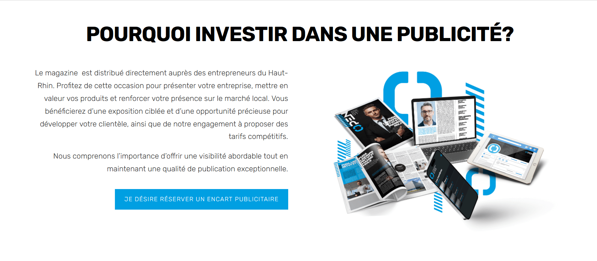 Avec notre magazine, vous êtes certains de gagner en visibilité car celui-ci est distribué en entreprise, sans compter que nous sommes présents sur des réseaux influents tels que Linkedin ou Instagram. Enfin vous disposez d’une plateforme en ligne pour contacter l’audience qui vous correspond.