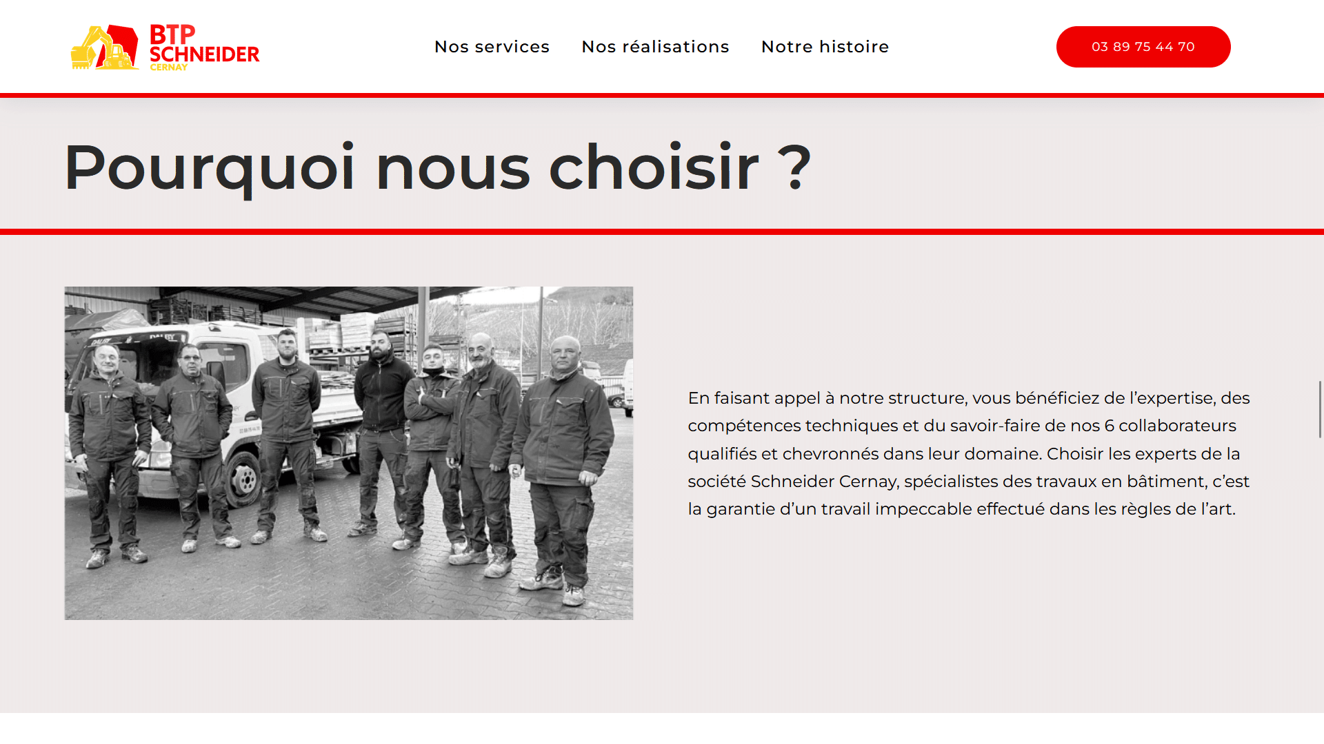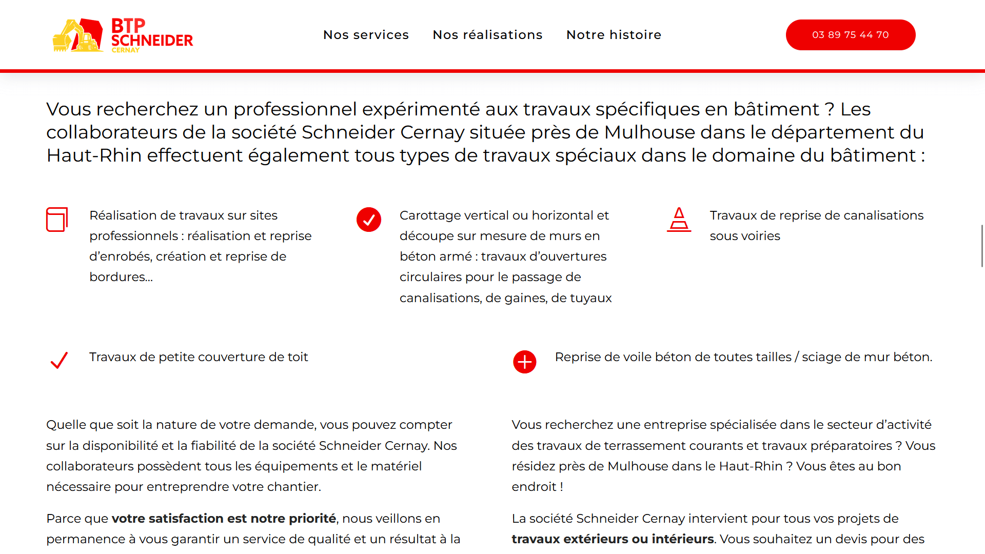 Le contenu à été rédigé afin de décrire les services proposés par Schneider. Il est optimisé SEO de manière à ce que les requêtes concernant les travaux apparaissent sur Google.